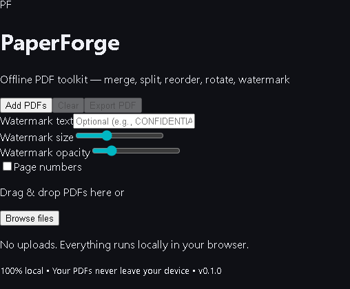 PaperForge is a lightweight, privacy‑first PDF studio that runs entirely in your browser. No servers, no sign‑ups, no uploads — your files never leave your device.